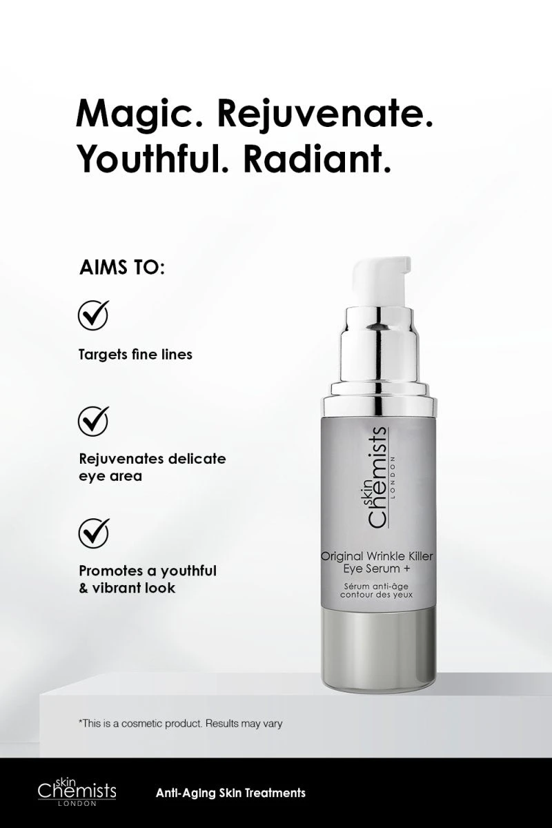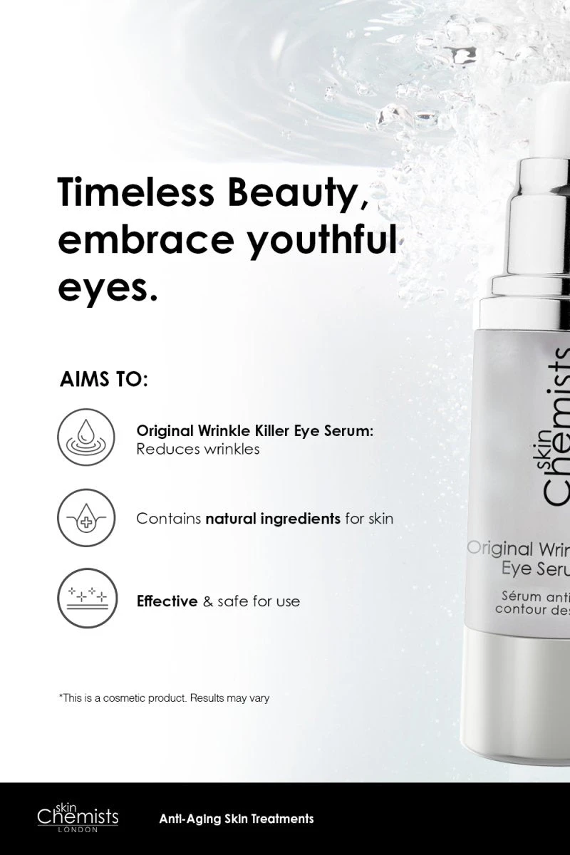 skinChemists Original Wrinkle Killer Eye Serum is a powerful formula that targets wrinkles and signs of ageing around the delicate eye area. Infused with ingredients like Persian Silk Tree Bark Extract and Aloe Barbadensis Leaf Juice Powder, this serum brightens, smooths, and hydrates the skin, promoting a youthful and healthy appearance. With its clean beauty and organic ingredients, it is a must-have for those seeking a natural and effective solution for their skincare routine.