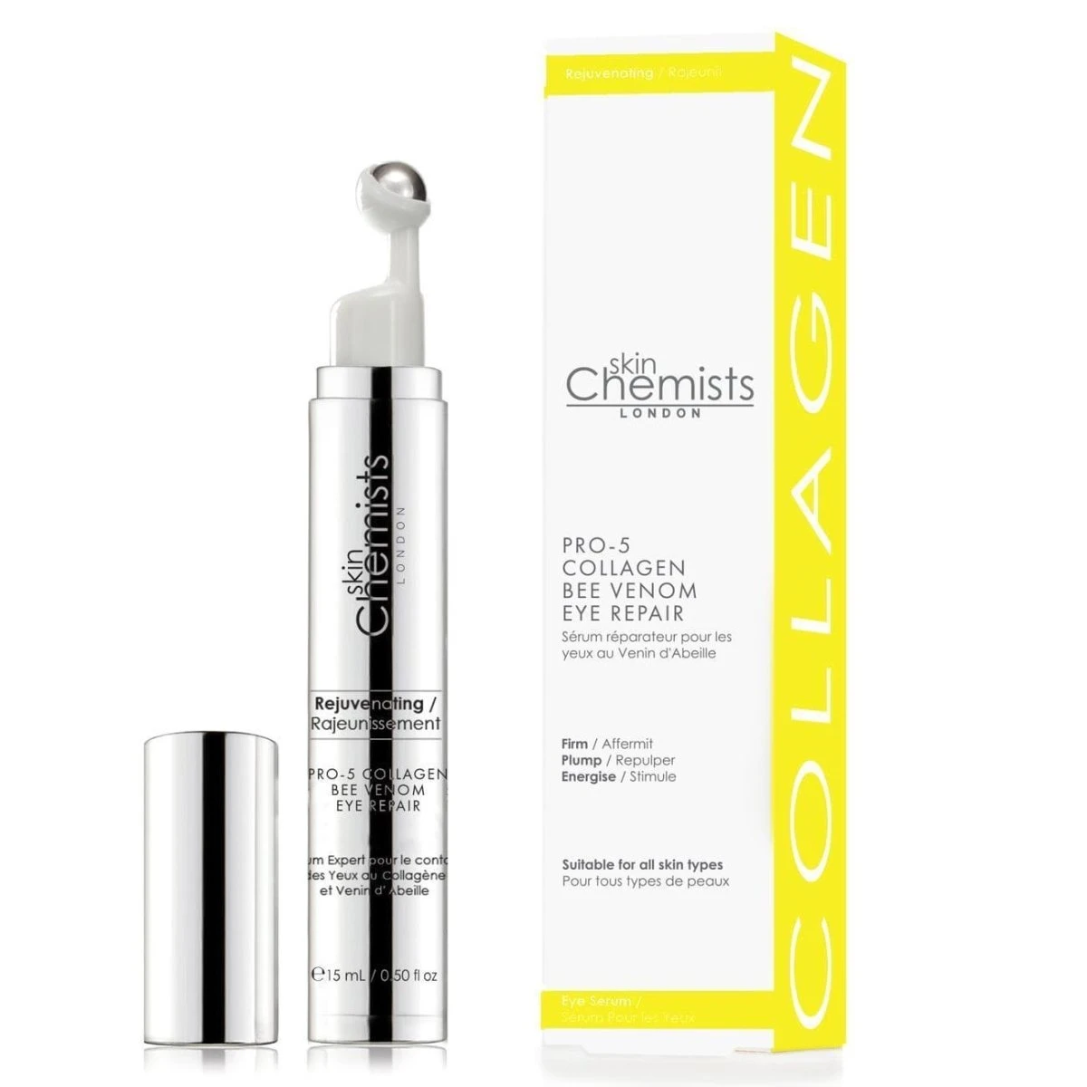 Our Pro-5 Collagen Bee Venom Eye Repair works by tricking the skin into thinking it has been likely stung and therefore brings blood to the surface of the skin quicker. This works to provide a plumping effect. It also works to stimulate the production of collagen in the skin.