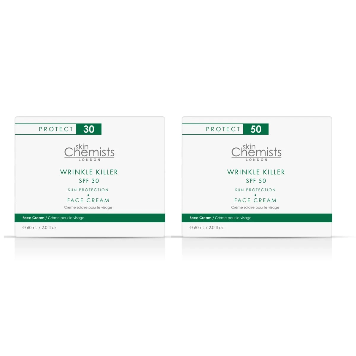 skinChemists Wrinkle Killer SPF Duo Pack helps to protect your face from harmful UV Rays, as well as provide a nourishing base for supple and soft skin through the use of sweet almond oil.